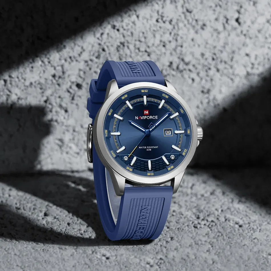 Para homens que valorizam estilo e praticidade, o relógio NAVIFORCE é a escolha certa. Com mostrador azul moderno e pulseira em silicone confortável, ele oferece resistência à água, função de data e um visual esportivo sofisticado, ideal para todas as ocasiões.