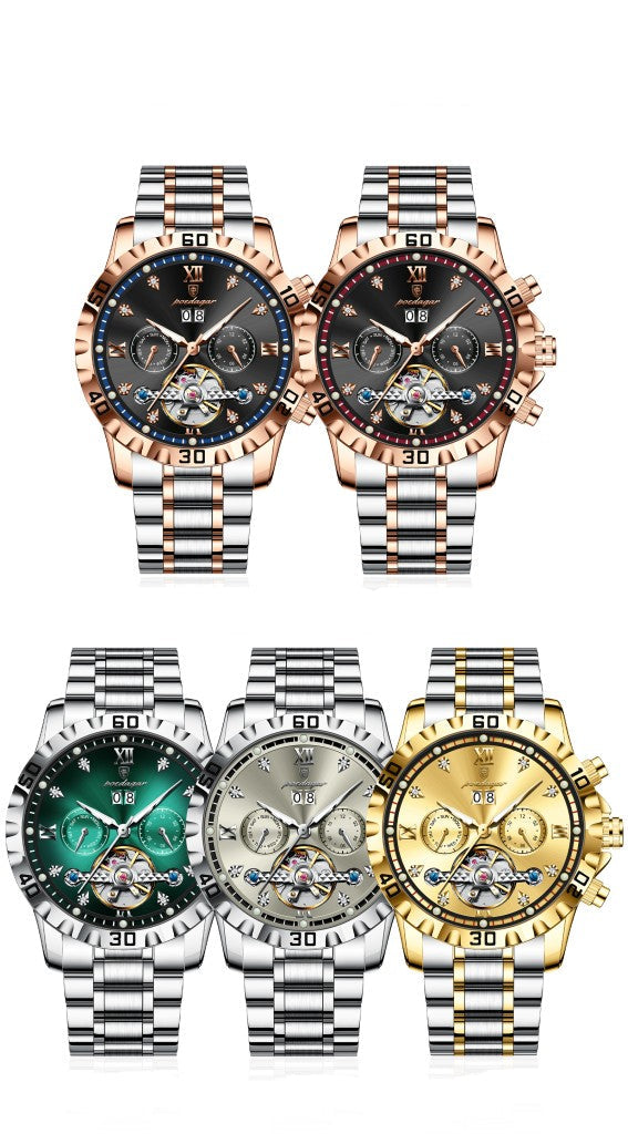 Um verdadeiro símbolo de elegância e poder. Este relógio automático Poedagar impressiona com seu mostrador verde com textura metálica, marcadores brilhantes e mecanismos visíveis que elevam o visual a um novo nível de sofisticação. Ideal para homens que valorizam presença e alto padrão.